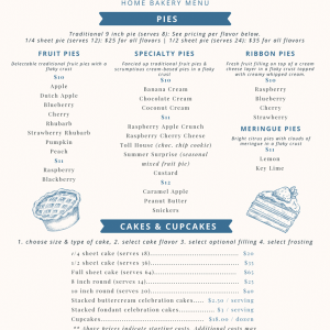 Fully Baked, Ready to Serve. We are proud to offer our delicious, homemade pies, cakes, and baked goods. Order a pie for someone you love, as a special gift, or just get one for yourself!